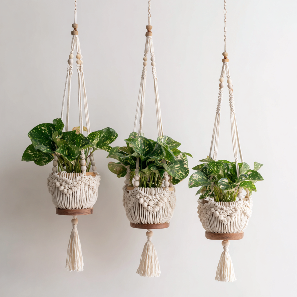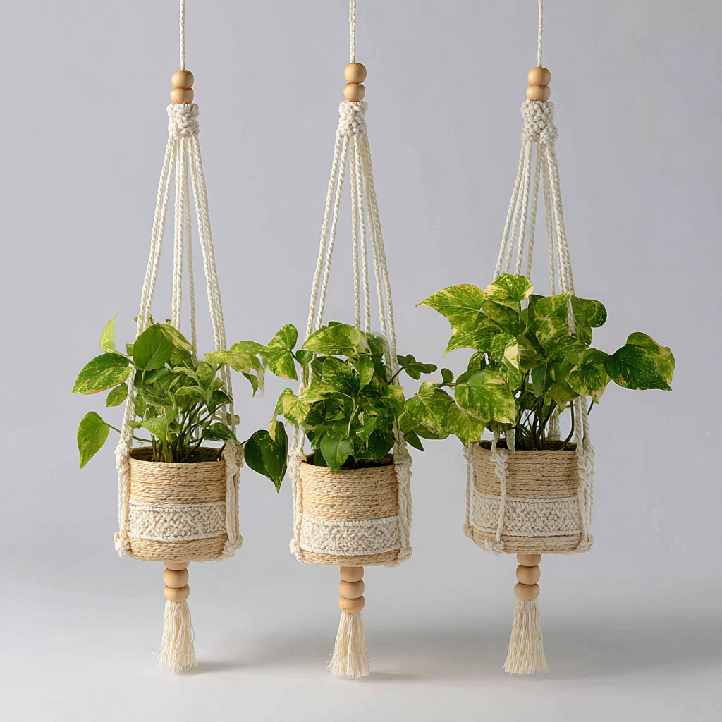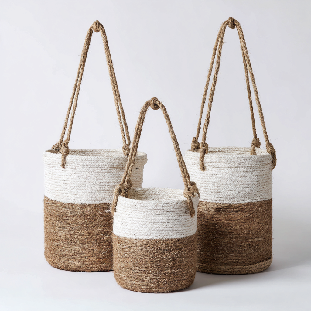 Doniczki ogrodowe wiszące - juta-bawełna 25x24-20x19-16x15 cm - Brązowy-Biały - Styl boho