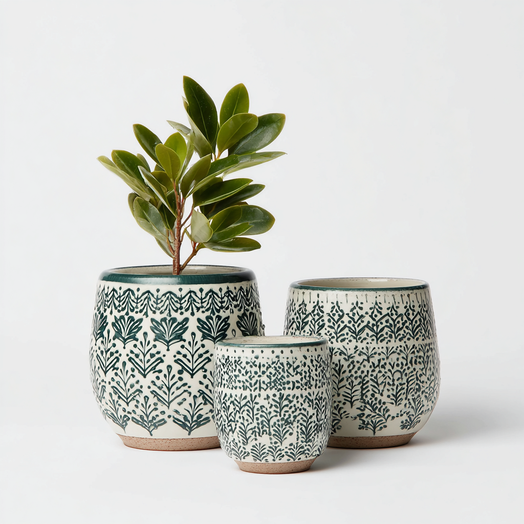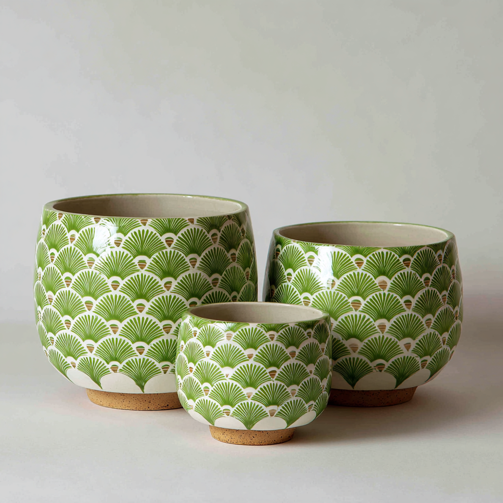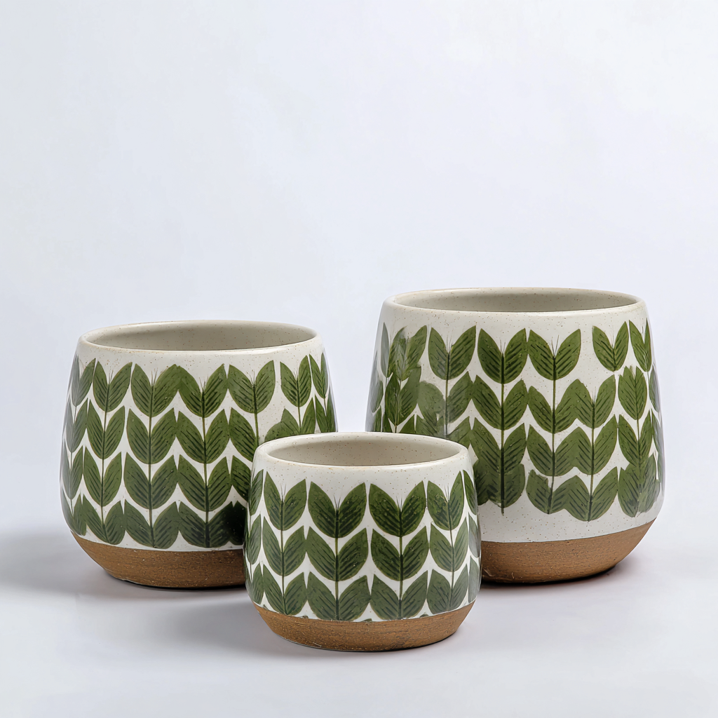 Doniczki ogrodowe - ceramiczne 22x21-19x18-15x14 cm - Zielony-Biały - Styl boho