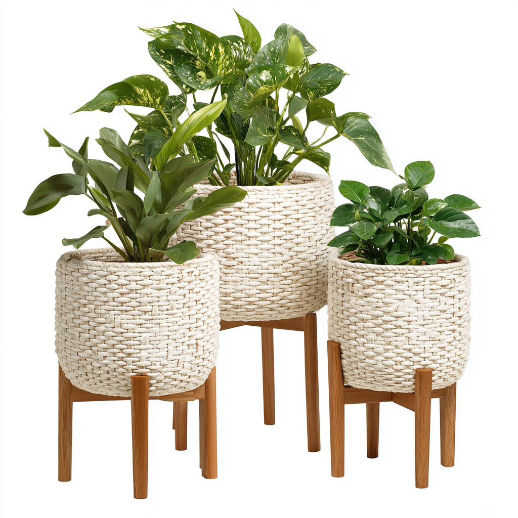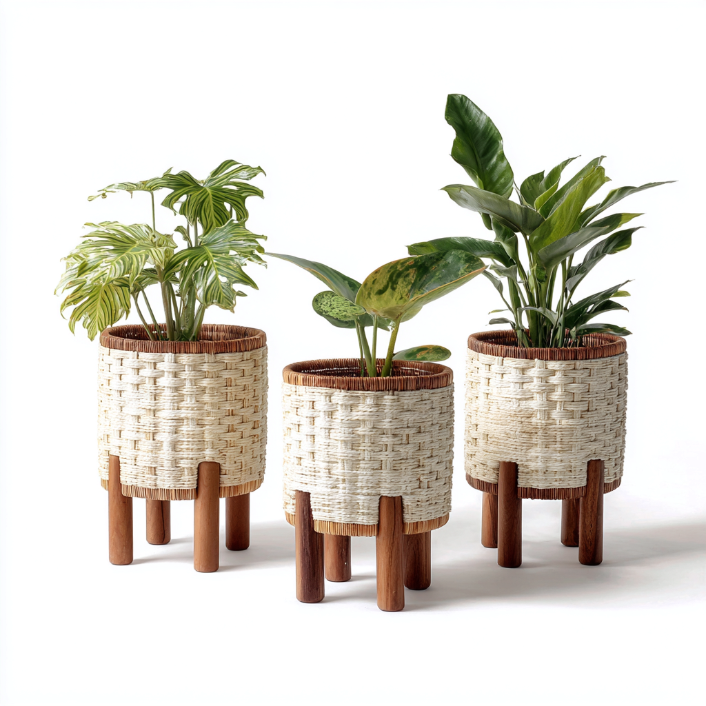 Doniczki ogrodowe - wiklina-drewno 25x35-21x30-18x26 cm - Beżowy-Brązowy - Styl boho