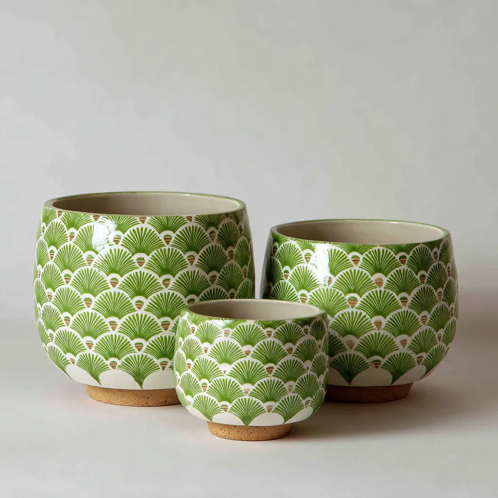 Zestaw trzech ceramicznych doniczek ogrodowych w kolorze białym, ozdobionych eleganckim zielonym wzorem wachlarzy w stylu art deco. Ich geometryczny, symetryczny design łączy klasykę z nowoczesnością, idealnie komponując się z wystrojem wnętrz i aranżacjami ogrodowymi.