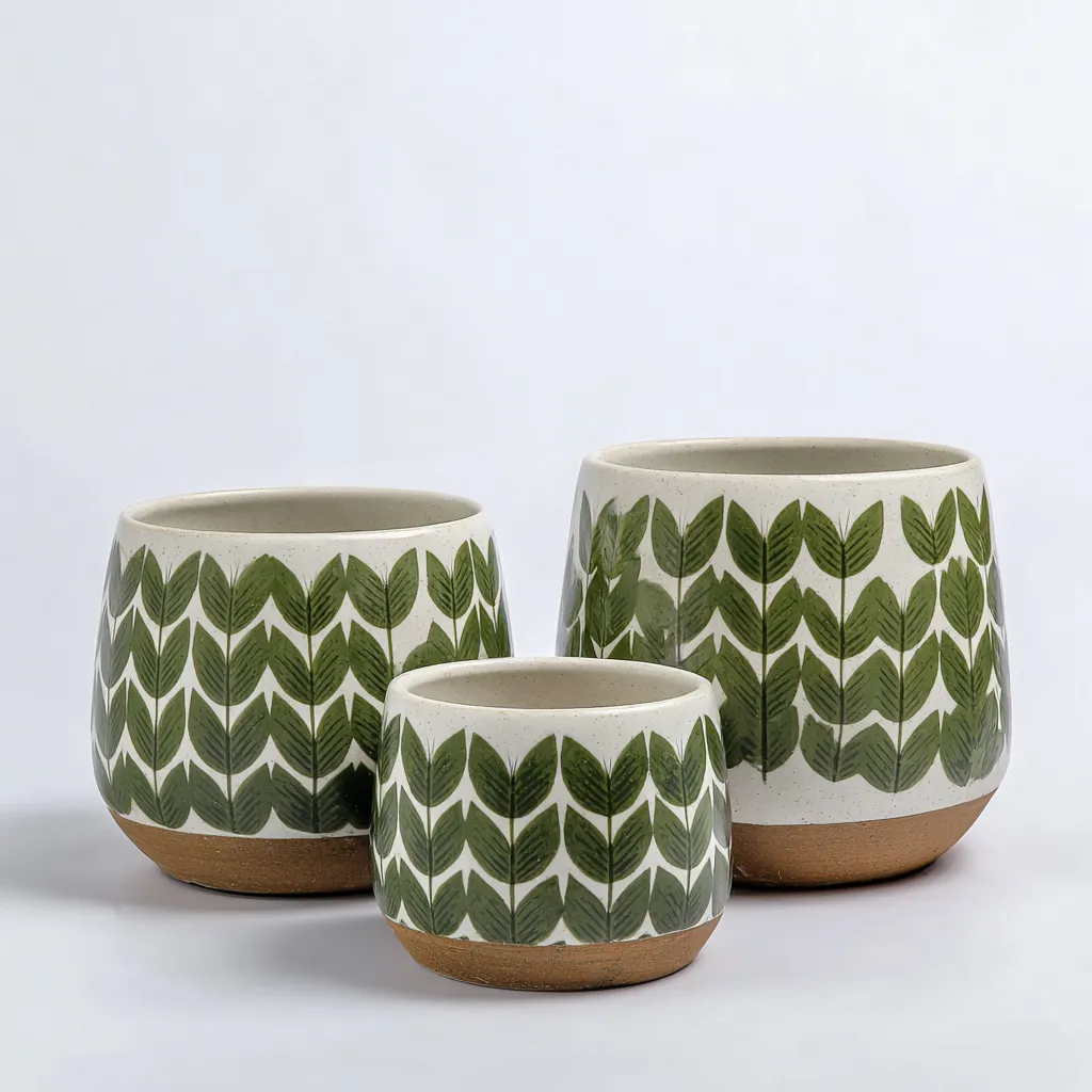 Doniczki wykonane z wysokiej jakości ceramiki pokrytej szkliwem ochronnym. Powierzchnia zdobiona nadrukiem liści w odcieniach zieleni na białym tle, z naturalną glinianą podstawą w kolorze terakoty. Krawędzie i wnętrze wykończone gładko, co zapewnia trwałość i łatwość czyszczenia.