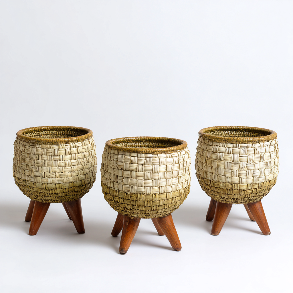 Doniczki wykonane są z wytrzymałej, naturalnej wikliny, a podstawę stanowią solidne nogi z drewna. Każdy element został ręcznie wykonany z dbałością o detale. Drewno zostało zabezpieczone ekologicznym lakierem, który chroni je przed wilgocią, natomiast wiklina jest elastyczna i odporna na uszkodzenia.