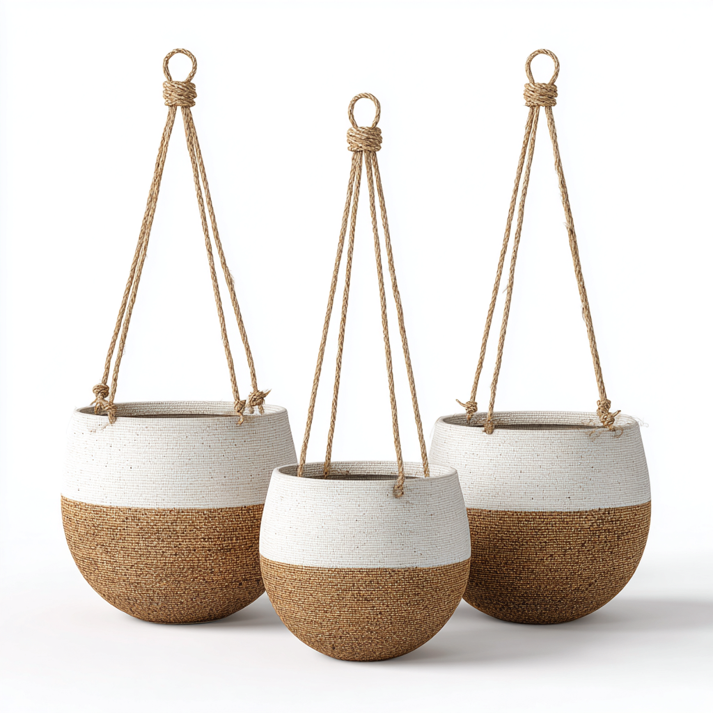 Zestaw trzech wiszących doniczek ogrodowych wykonanych z naturalnej juty i białego płótna. Ich półokrągły kształt oraz minimalistyczny design w stylu boho idealnie wpasowują się w nowoczesne wnętrza, tarasy i balkony, dodając przestrzeni lekkości i naturalnego uroku.