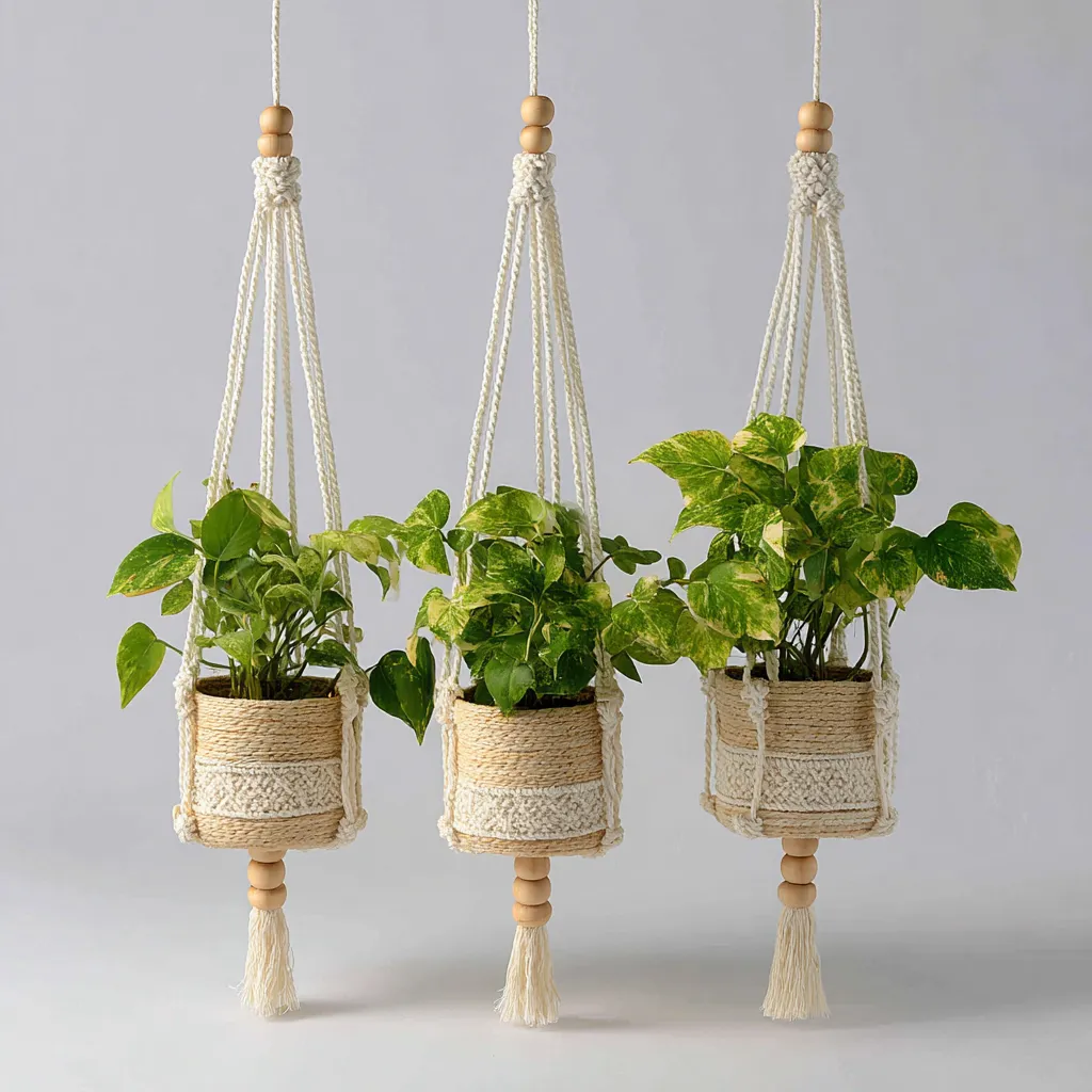 Zestaw trzech wiszących doniczek ogrodowych wykonanych z naturalnych materiałów - splecionego sznurka, bawełny i trawy morskiej. Ich oryginalny design z dekoracyjnymi koralikami i frędzlami tworzy delikatny, naturalny akcent w stylu boho, idealny do wnętrz, balkonów i tarasów.