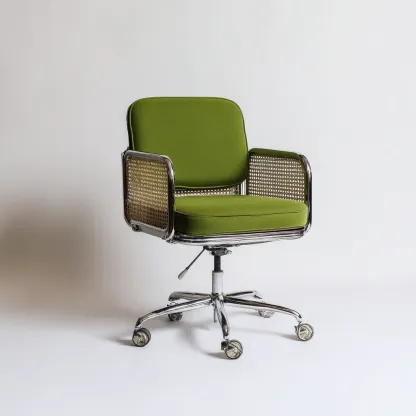 Siedzisko i oparcie pokryte są miękką tkaniną w intensywnym kolorze zielonym. Boki wykonane są z naturalnego rattanu wplecionego w metalową ramę, co nadaje meblowi lekkości i elegancji. Chromowana metalowa podstawa z kółkami zapewnia trwałość oraz stabilność użytkowania.