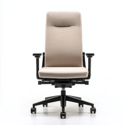 Siedzisko i oparcie pokryte tkaniną o wysokiej odporności na ścieranie w eleganckim beżowym kolorze. Stabilna podstawa wykonana z metalu w czarnym, matowym wykończeniu. Mechanizm regulacji wysokości, odchylenia oparcia oraz podłokietników zapewnia indywidualne dopasowanie do użytkownika.