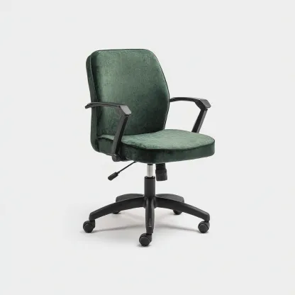 Nowoczesne i wygodne krzesło biurowe tapicerowane eleganckim ciemnozielonym welurem. Zapewnia wyjątkowy komfort podczas pracy i dodaje wnętrzu stylowego charakteru. Idealne do biura, gabinetu lub przestrzeni domowej.