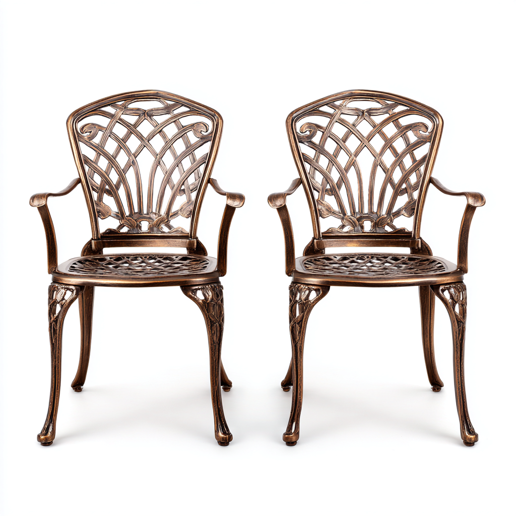 Zestaw dwóch klasycznych krzeseł ogrodowych z podłokietnikami to eleganckie i trwałe rozwiązanie do każdej przestrzeni zewnętrznej.Dzięki bogatym zdobieniom i solidnej konstrukcji doskonale sprawdzą się w ogrodzie、na tarasie lub patio,tworząc stylową strefę relaksu.