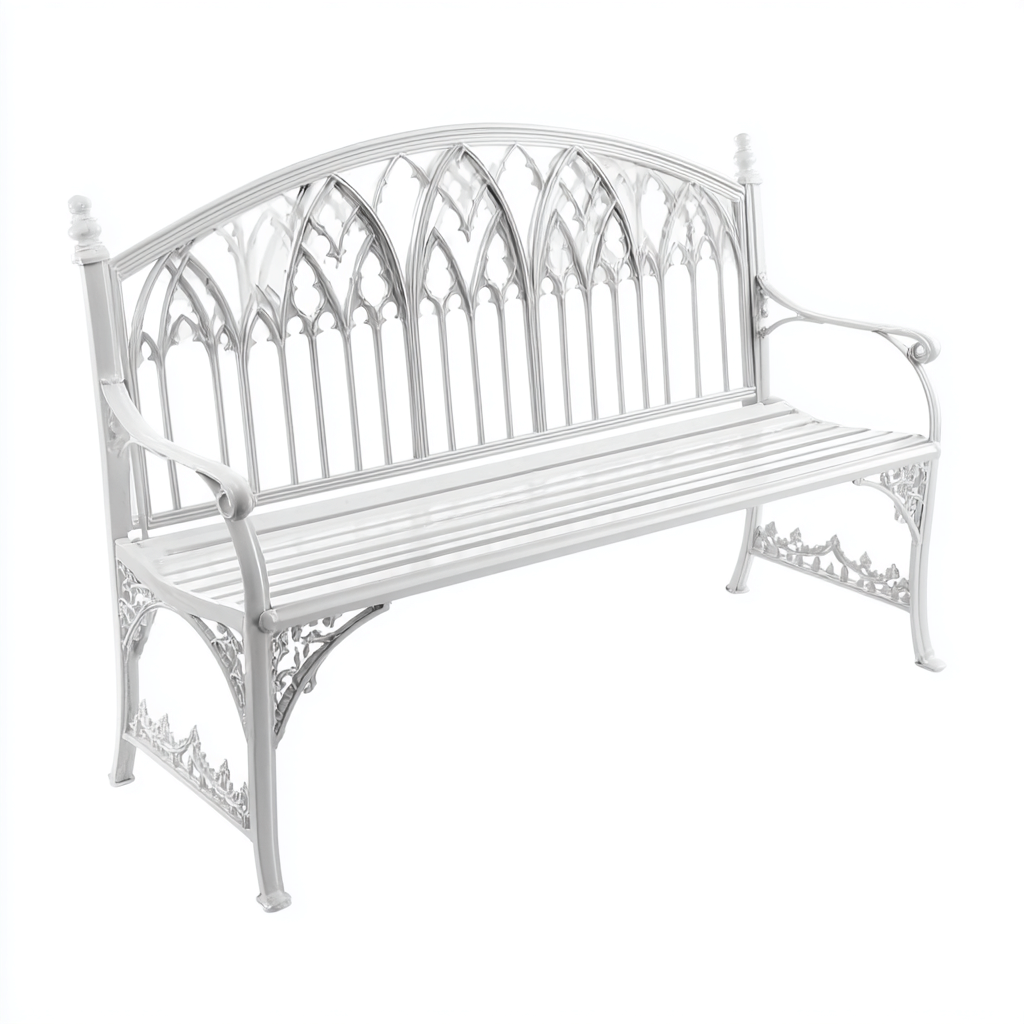 Elegancka ławka ogrodowa w stylu gotyckim, wykonana z metalu w kolorze białym. Jej oparcie zdobią efektowne, strzeliste łuki inspirowane architekturą katedralną, co nadaje meblowi majestatyczny i artystyczny charakter. Idealna do klasycznych ogrodów, oranżerii czy reprezentacyjnych tarasów.