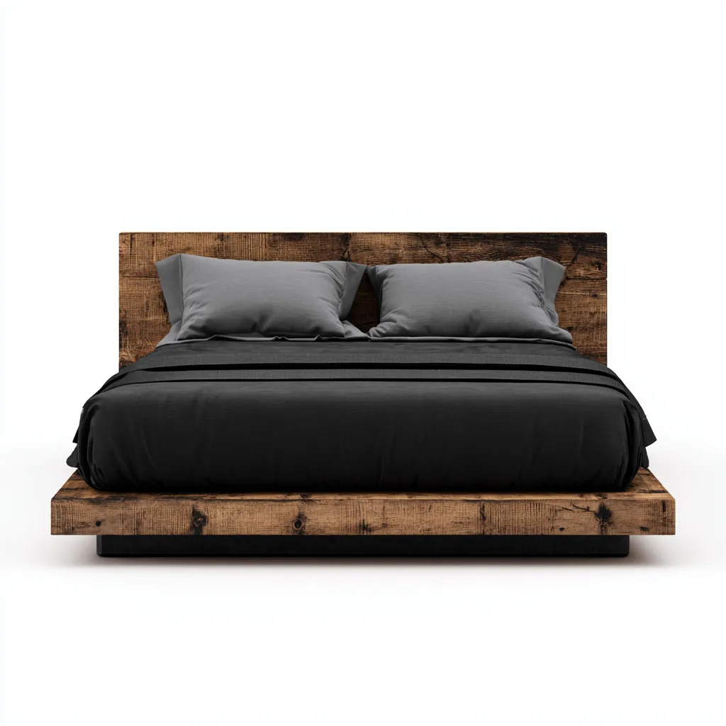 Industrialne łóżko podwójne o solidnej i niskiej konstrukcji to idealny wybór dla osób ceniących minimalistyczny styl z charakterem. Połączenie surowego drewna z prostą formą nadaje wnętrzu loftowy klimat, wprowadzając jednocześnie ciepło i nowoczesną elegancję.