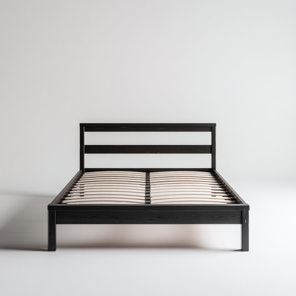 Minimalistyczne łóżko podwójne wykonane z litego drewna w eleganckim czarnym kolorze. Prosta forma z poziomymi listwami w wezgłowiu i lekką konstrukcją doskonale komponuje się z wnętrzami nowoczesnymi, loftowymi i skandynawskimi.