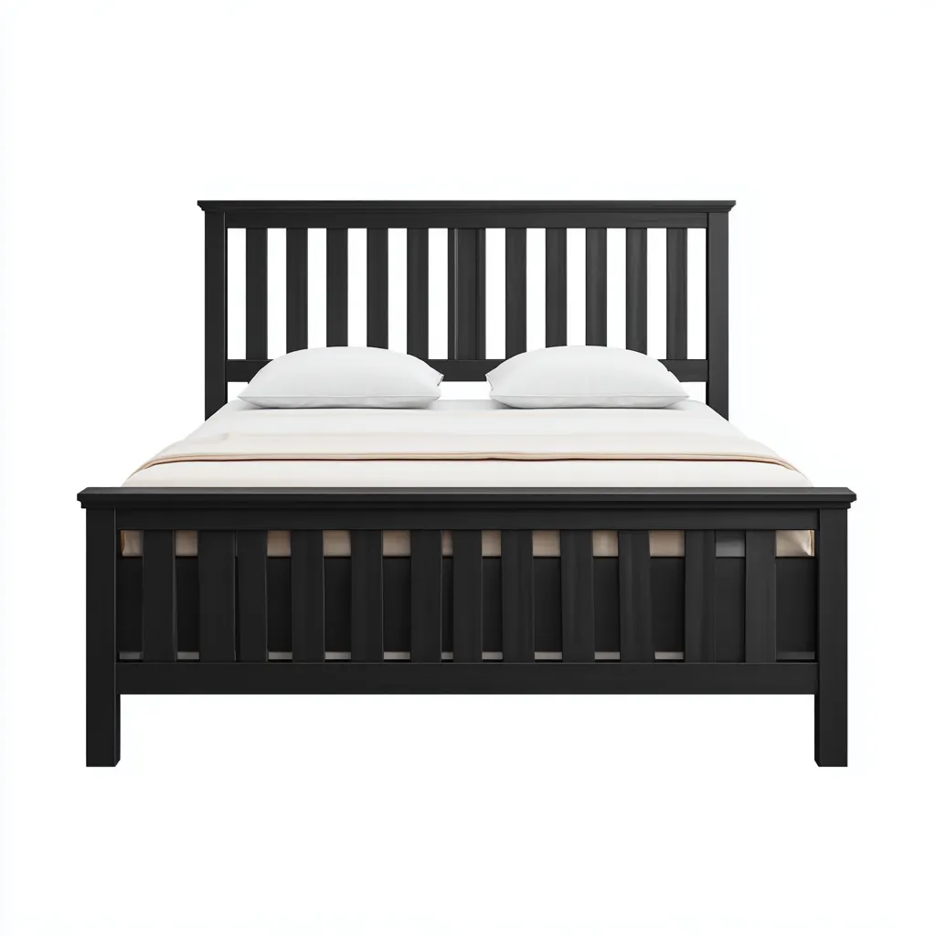 Eleganckie łóżko podwójne wykonane z litego drewna - sosnowego w klasycznym czarnym kolorze. Jego prosty, symetryczny design z pionowymi listwami w wezgłowiu i froncie nadaje sypialni elegancję i ponadczasowy charakter.