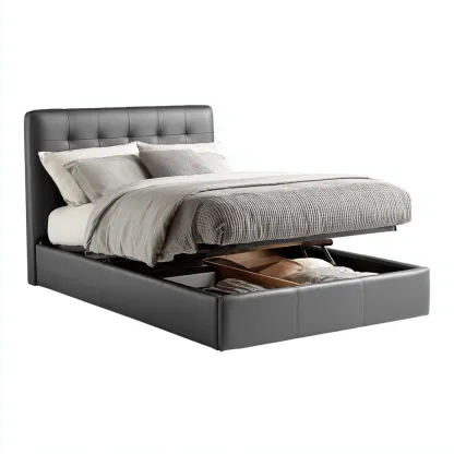 Łóżko posiada pojemny schowek na pościel, idealny do przechowywania koców, poduszek lub ubrań sezonowych. Mechanizm gazowy gwarantuje lekkie i bezpieczne otwieranie. Tapicerowane wezgłowie zapewnia wygodne oparcie podczas czytania lub oglądania telewizji.