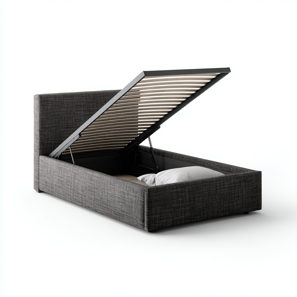 Łóżko wyposażone w przestronny pojemnik na pościel, idealny do przechowywania kołder, poduszek i innych akcesoriów. Mechanizm podnoszenia wspomagany siłownikami gazowymi zapewnia płynne i lekkie otwieranie. Minimalistyczny design pozwala łatwo dopasować mebel do różnych aranżacji sypialni.