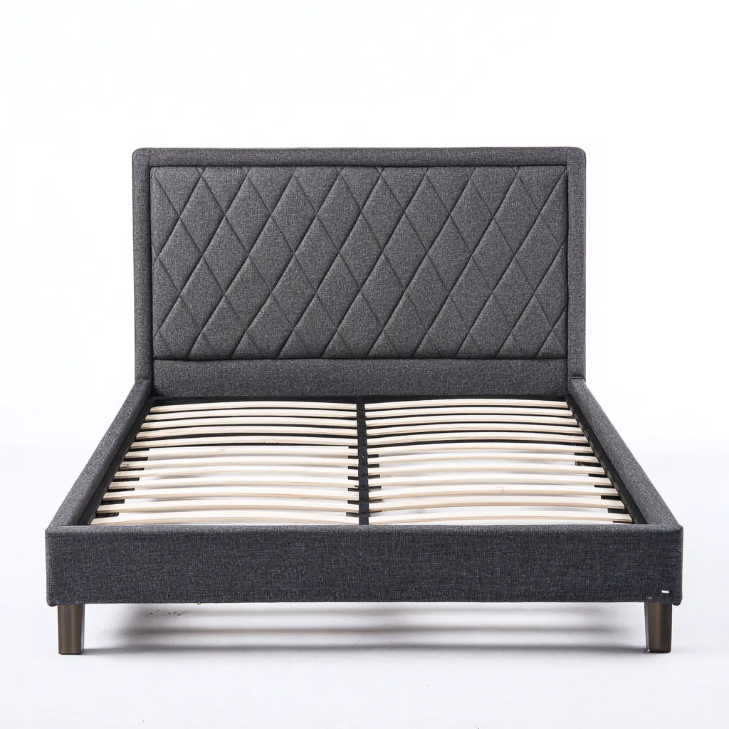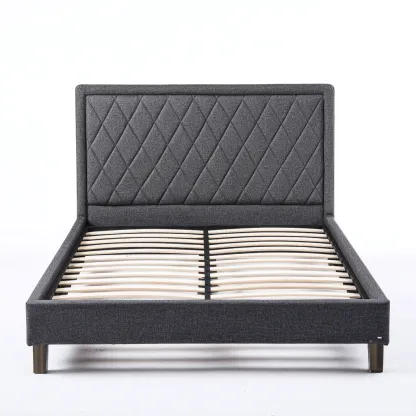 Solidna rama wykonana z metalu, obita tkaniną o gęstym splocie w kolorze ciemnoszarym. Wezgłowie ozdobione pikowaniem w romby, wypełnione miękką pianką. Stelaż z elastycznych listew drewnianych zapewnia odpowiednią wentylację i podparcie materaca.