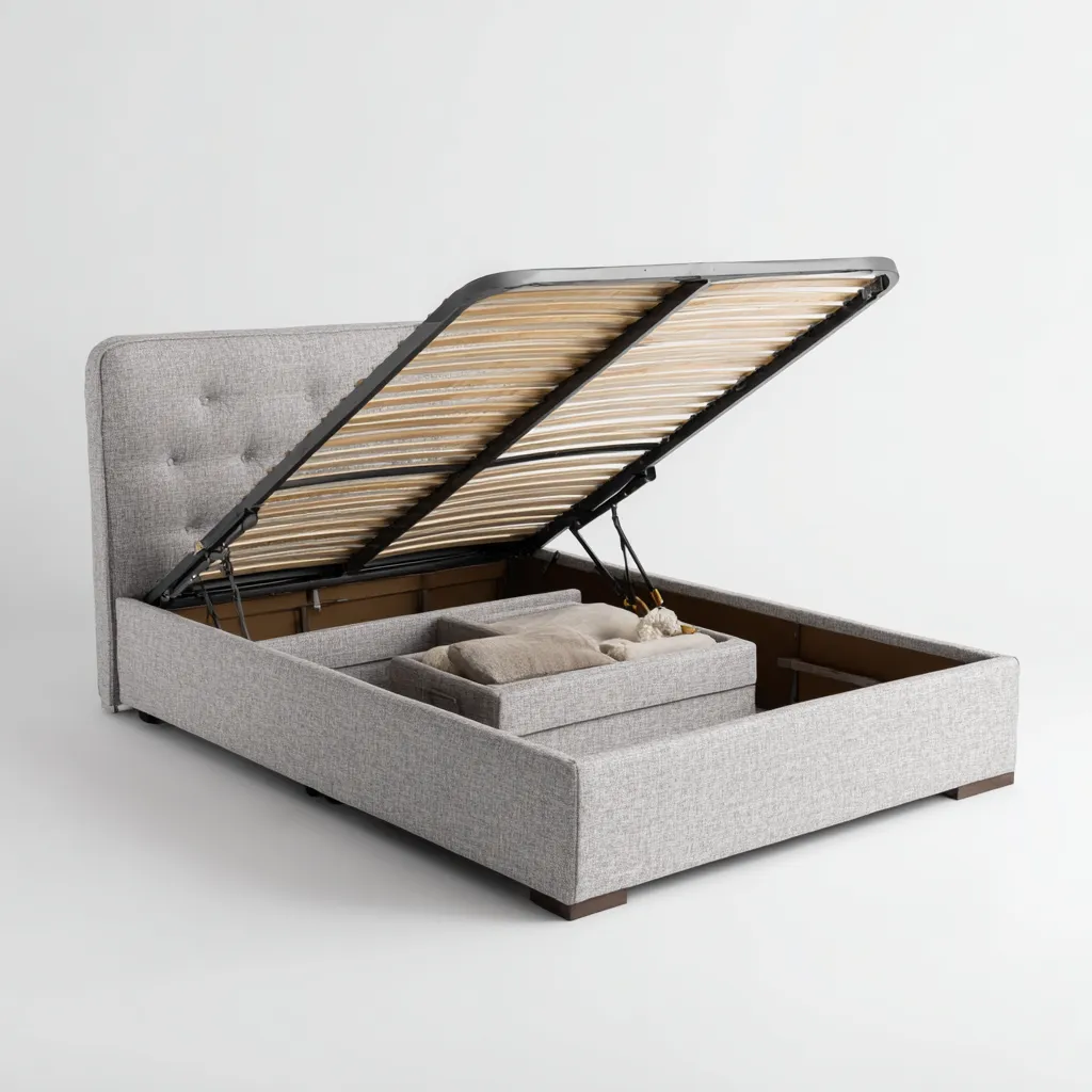 Wbudowany pojemnik zapewnia dodatkową przestrzeń do przechowywania pościeli lub innych rzeczy. Łóżko jest łatwe do złożenia i posiada wygodny system otwierania, co czyni je wygodnym i funkcjonalnym wyborem.