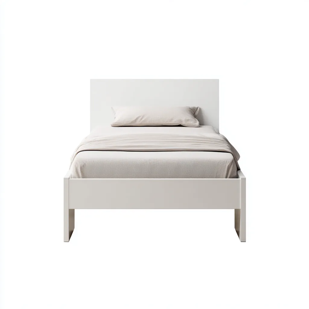 Nowoczesne łóżko pojedyncze w minimalistycznym stylu, wykonane z drewna w kolorze białym. Charakteryzuje się prostą, geometryczną formą i wysokim zagłówkiem, dzięki czemu doskonale pasuje do nowoczesnych i jasnych sypialni.