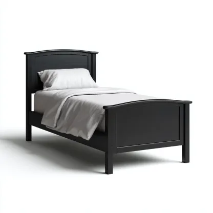 Stylowe łóżko pojedyncze wykonane z drewna w kolorze czarnym to elegancki mebel o klasycznej formie. Delikatnie zaokrąglone wezgłowie i zanóżek nadają mu subtelnego charakteru i doskonale komponują się z różnymi aranżacjami wnętrz.
