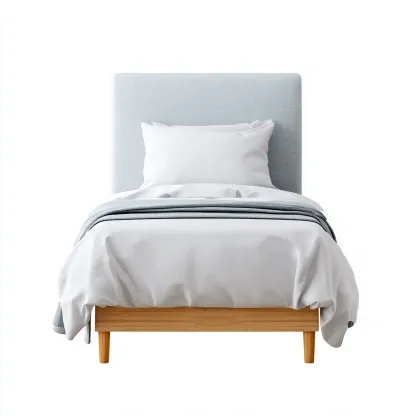 Eleganckie łóżko pojedyncze tapicerowane tkaniną w kolorze jasnoniebieskim łączy nowoczesny design z funkcjonalnością i komfortem. Prosty kształt i drewniane nogi nadają mu lekkości, sprawiając, że doskonale komponuje się z wnętrzami w stylu skandynawskim lub minimalistycznym.