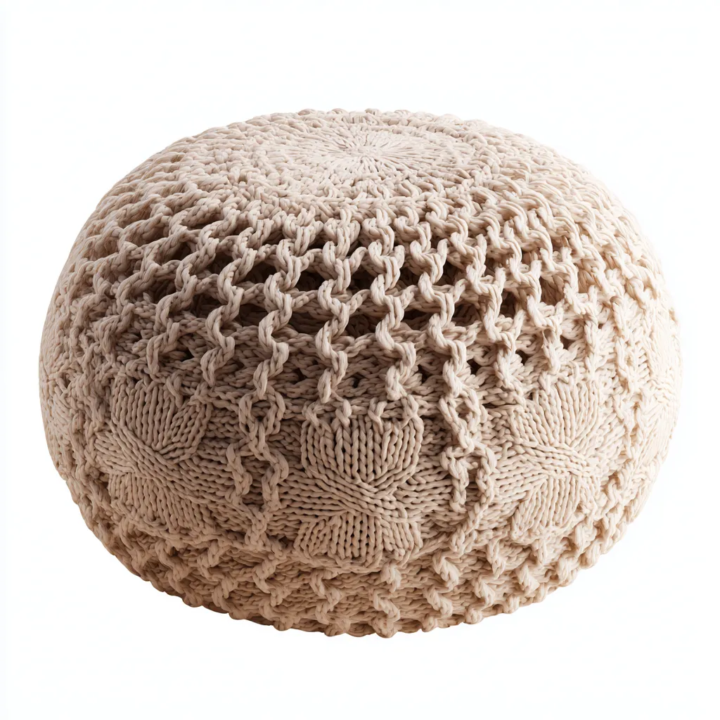 Podnóżek wykonano z wysokogatunkowej dzianiny bawełnianej, ręcznie plecionej w efektowny, ażurowy wzór.Wnętrze wypełniono lekkim i sprężystym materiałem, który zachowuje kształt i zapewnia komfort użytkowania.Naturalny beżowy odcień nadaje meblowi subtelności i uniwersalności.