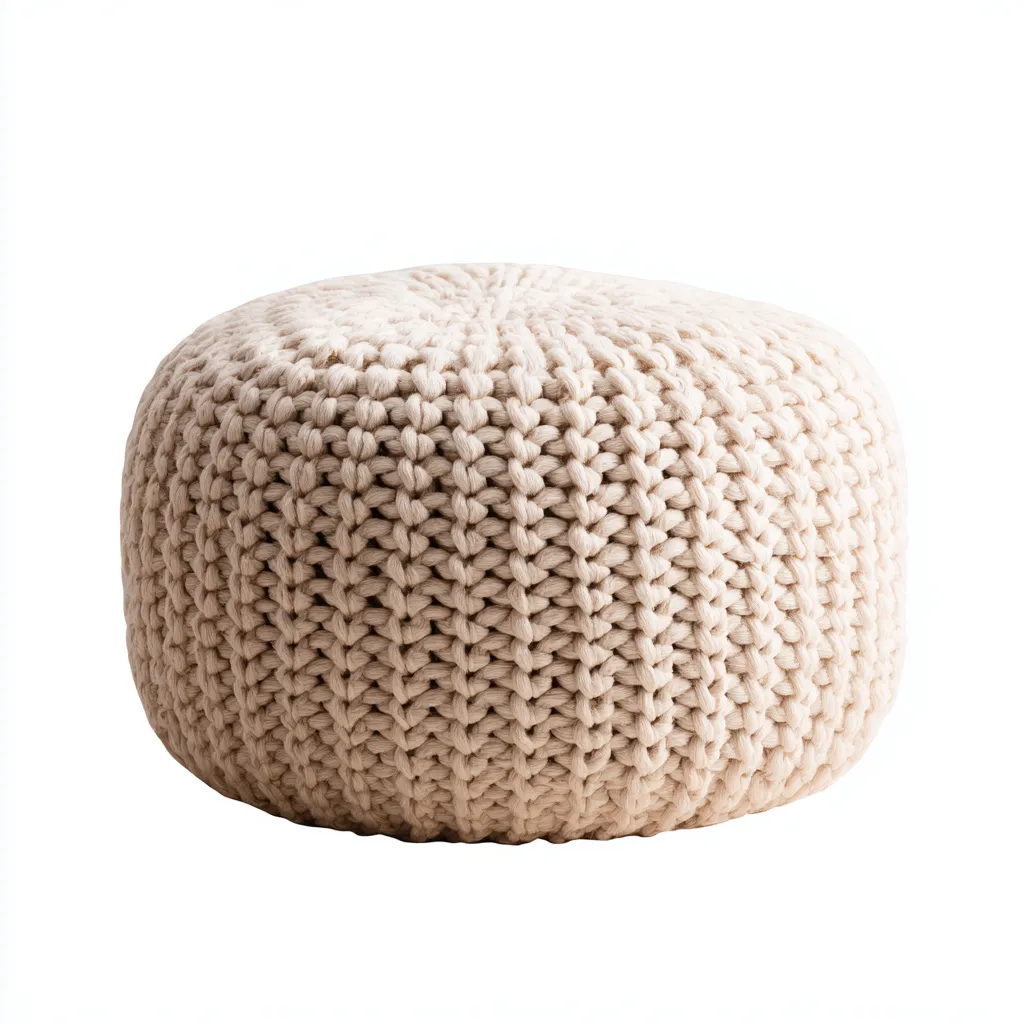 Elegancki podnóżek wykonany z grubego splotu bawełnianej dzianiny w naturalnym beżowym kolorze to idealny dodatek do wnętrz inspirowanych stylem skandynawskim i minimalistycznym.Dzięki swojej miękkiej formie i naturalnemu wyglądowi wnosi do pomieszczenia przytulność oraz harmonię.