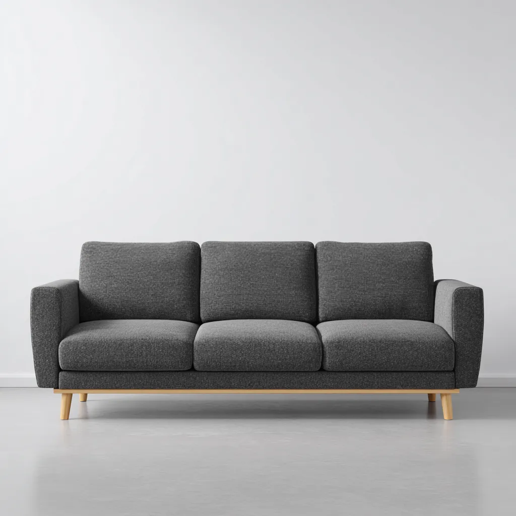 Trzyosobowa sofa w stylu skandynawskim o prostych liniach i eleganckim designie to doskonałe połączenie komfortu i minimalizmu. Ciemnoszara tapicerka wprowadza do wnętrza harmonię i wyważony charakter, a drewniane nogi dodają całości ciepła oraz lekkości.