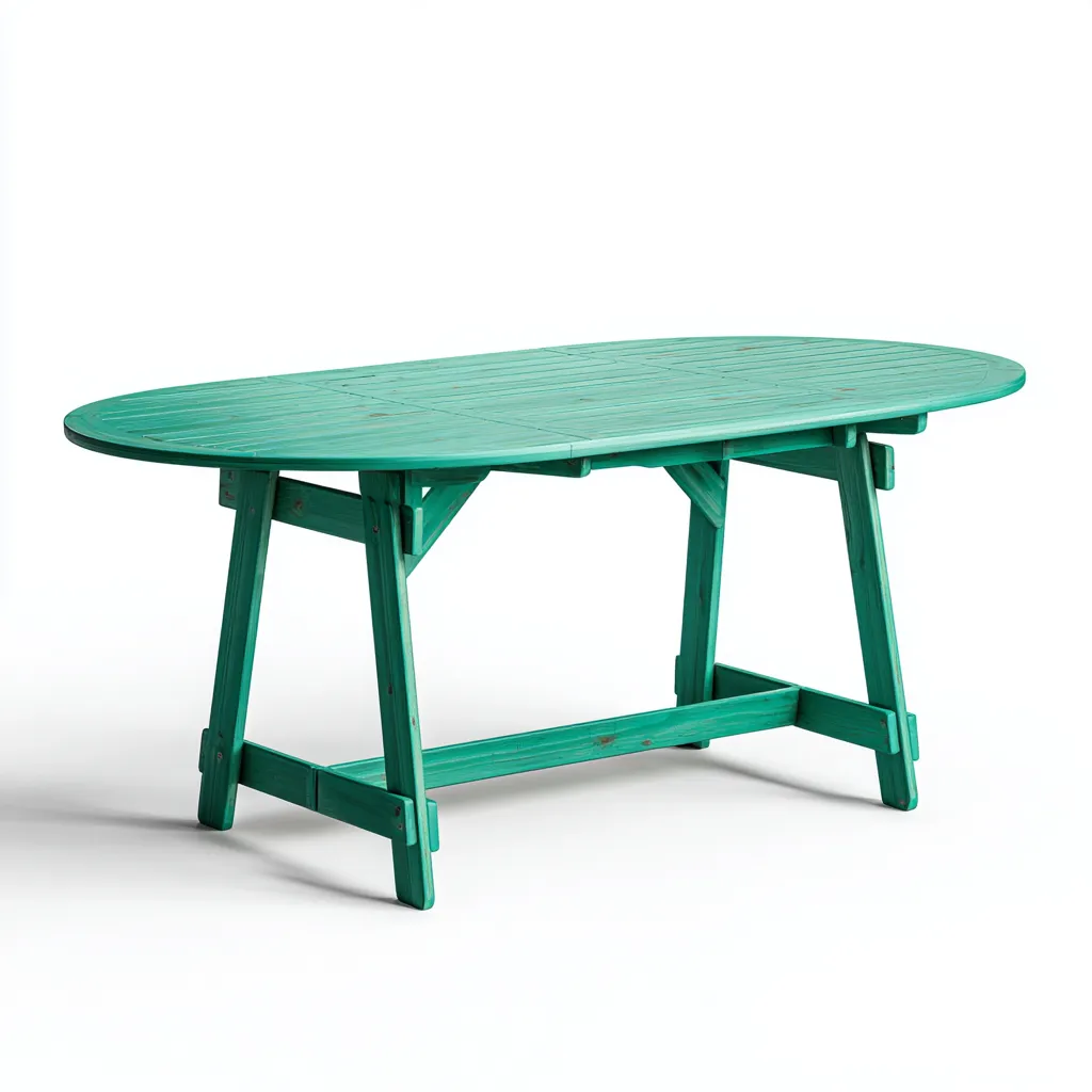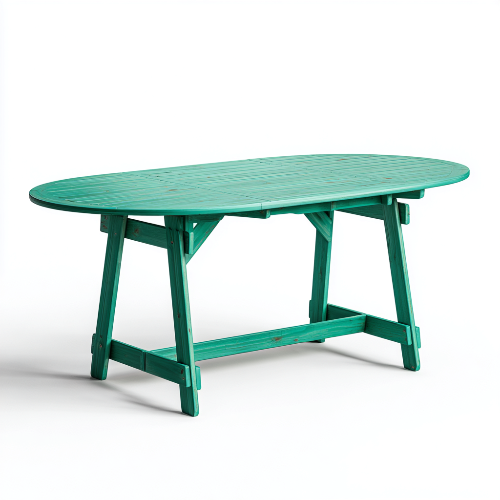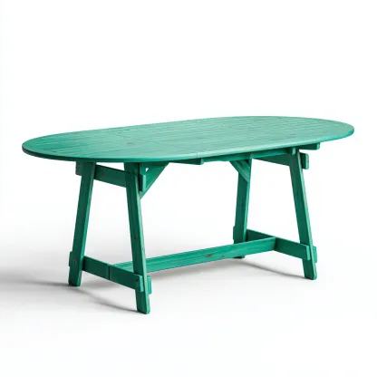 Nowoczesny stół ogrodowy o owalnym kształcie, wykonany z solidnego drewna w eleganckim turkusowym kolorze. Doskonały do użytku na tarasie, w ogrodzie lub na werandzie. Jego funkcjonalna forma łączy klasyczny wygląd z praktycznością, idealnie sprawdzając się podczas spotkań rodzinnych i przyjęć na świeżym powietrzu.