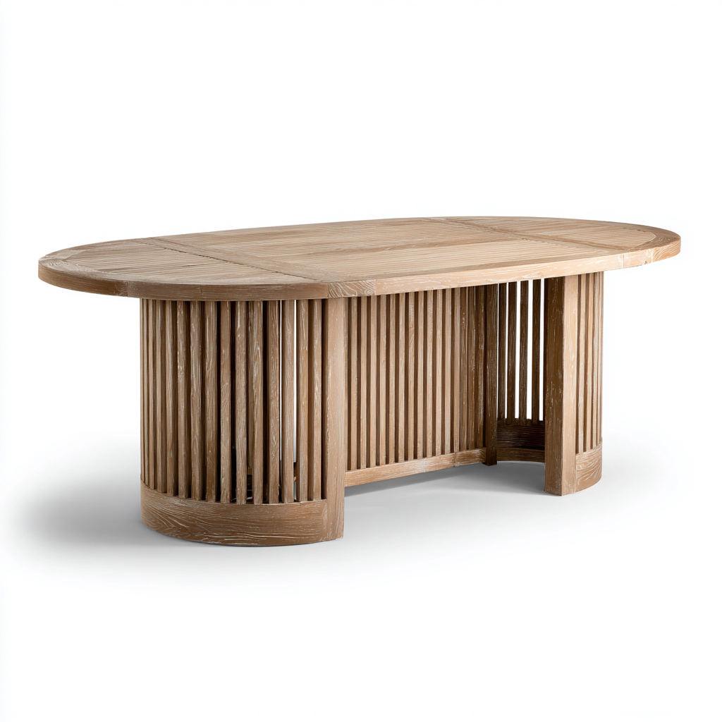 Nowoczesny owalny stół ogrodowy o eleganckiej i solidnej konstrukcji, wykonany z naturalnego drewna w ciepłym odcieniu brązu. Jego wyjątkowy design z pionowymi lamelami w podstawie dodaje lekkości i charakteru, czyniąc go centralnym punktem każdej przestrzeni zewnętrznej.