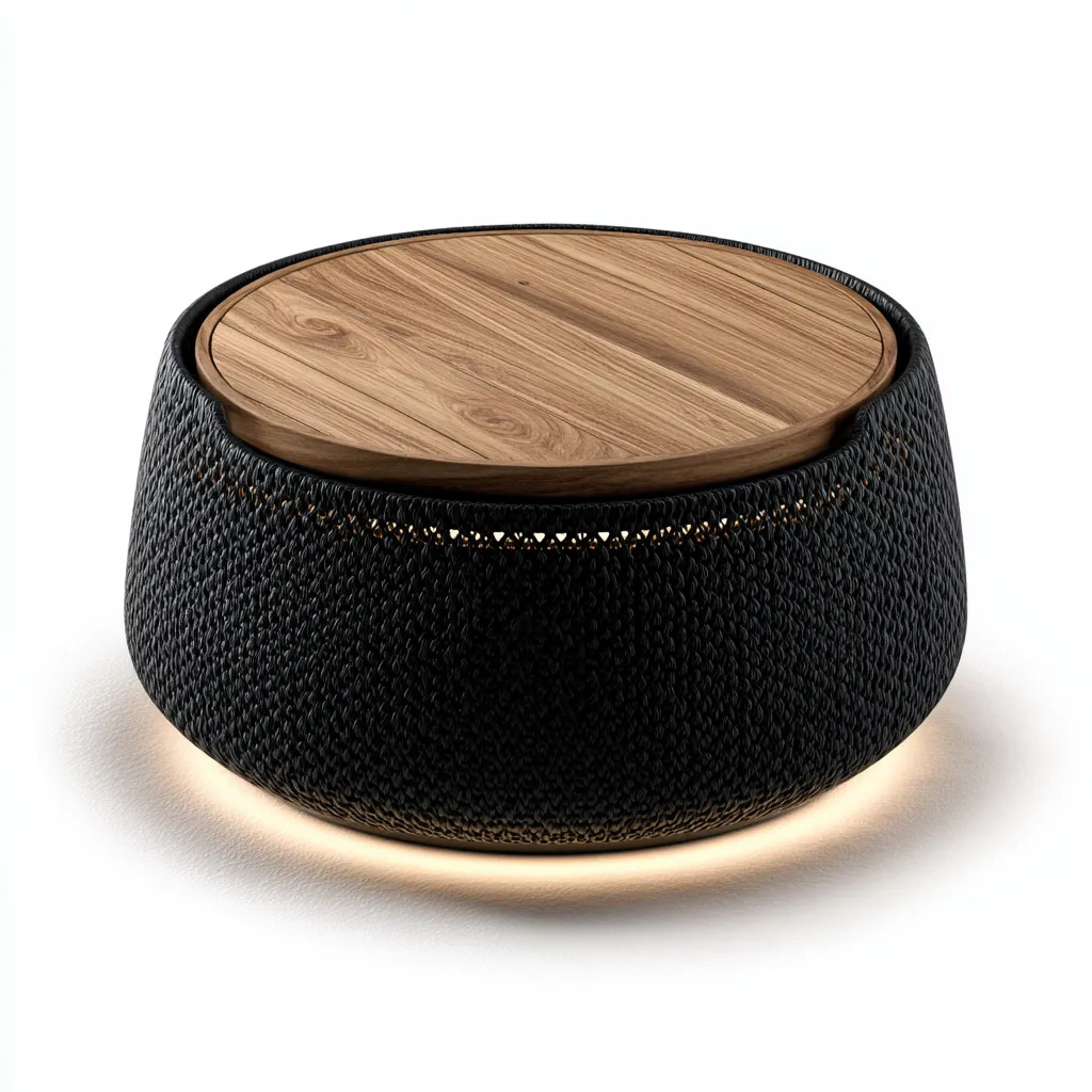 Nowoczesny okrągły stół ogrodowy o wyjątkowym designie, łączący naturalne drewno z technorattanem w eleganckim czarnym kolorze. Wbudowane oświetlenie LED tworzy przyjemną atmosferę i podkreśla luksusowy charakter mebla, idealnie sprawdzając się podczas wieczornych spotkań na tarasie lub w ogrodzie.