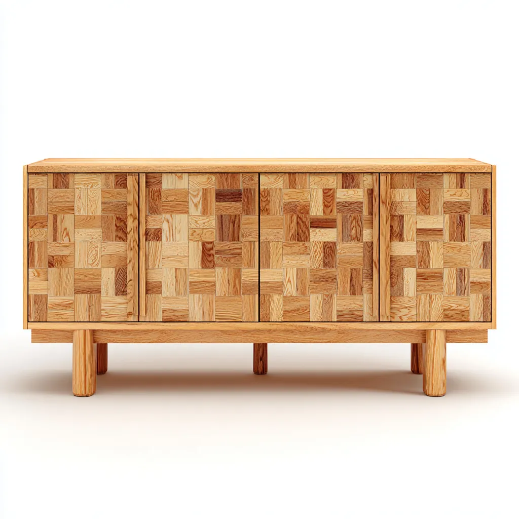 Stylowa szafka RTV wykonana z naturalnego drewna-dębowego o wyjątkowym wzorze mozaikowym. Ręcznie układane panele frontowe tworzą niepowtarzalny geometryczny motyw, nadając meblowi ciepły, przytulny charakter i nowoczesny wygląd. Idealna do salonów, w których liczy się estetyka i funkcjonalność.
