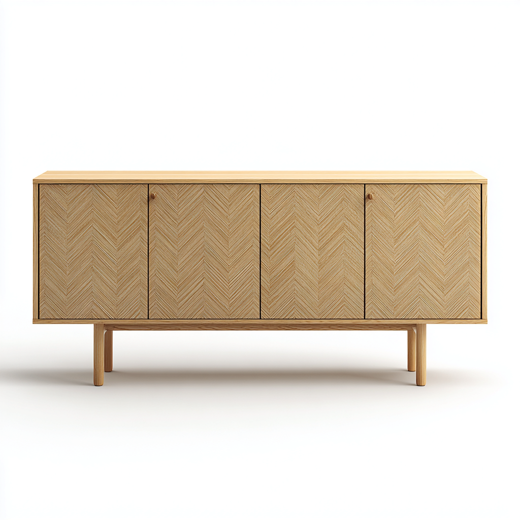 Elegancka szafka RTV w stylu skandynawskim wykonana z naturalnego drewna-dębowego. Minimalistyczna forma, czyste linie oraz delikatny wzór w jodełkę na frontach tworzą harmonijny mebel, który doskonale komponuje się z jasnymi i przytulnymi wnętrzami.