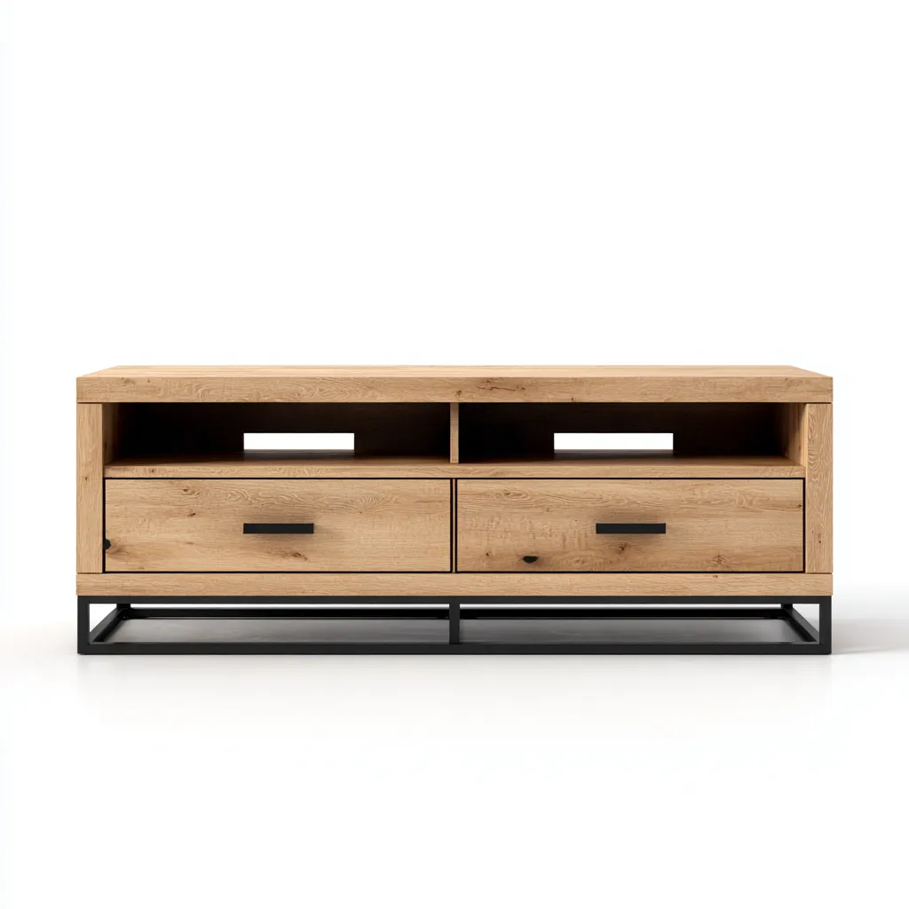 Nowoczesna szafka RTV w stylu industrialnym łącząca naturalne drewno-dębowe z metalową podstawą. Prosty, geometryczny kształt i surowe wykończenie nadają meblowi elegancki, a jednocześnie funkcjonalny charakter. Idealna do wnętrz loftowych i nowoczesnych salonów.