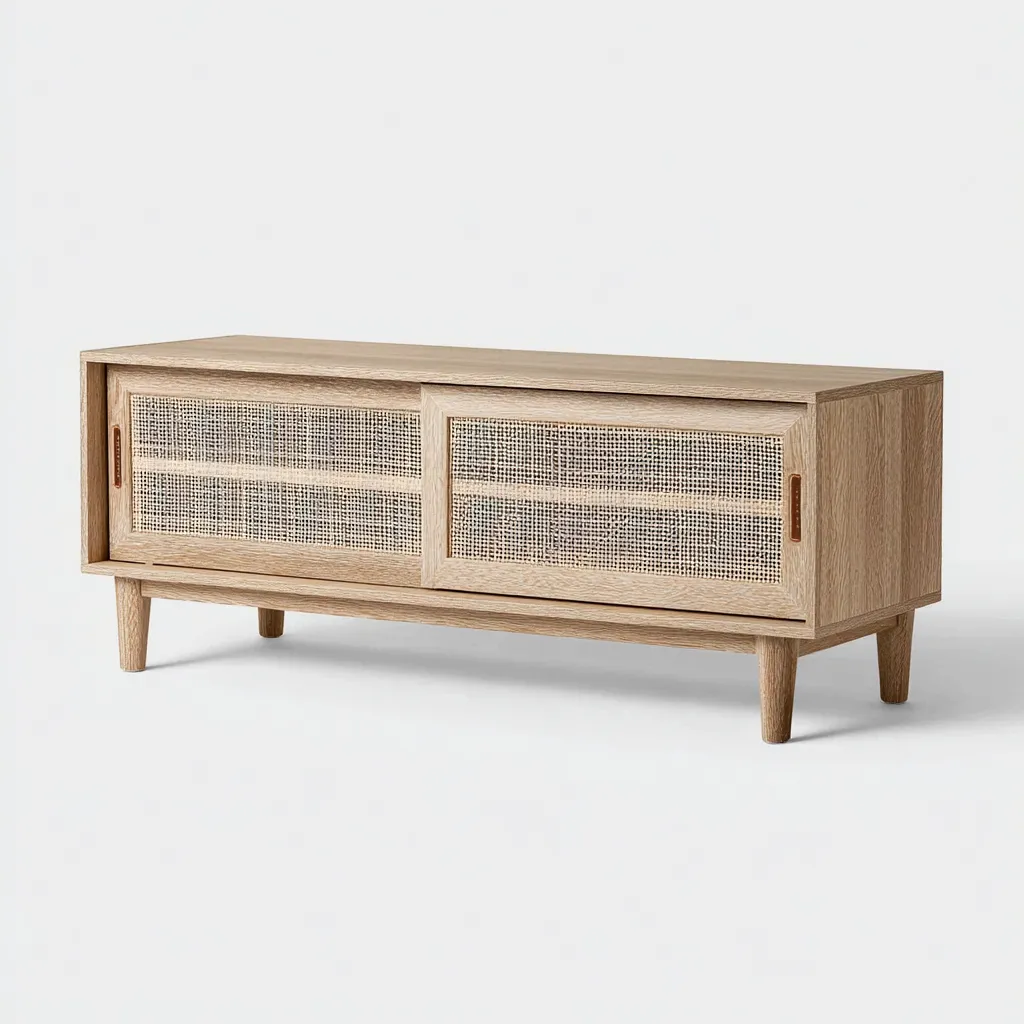 Elegancka szafka RTV w stylu boho wykonana z drewna-dębowego z naturalnymi frontami rattanowymi. Jej subtelna forma i jasna kolorystyka nadają wnętrzu lekkości i przytulności. Idealna do salonów inspirowanych naturą, w których liczy się prostota i ciepło naturalnych materiałów.