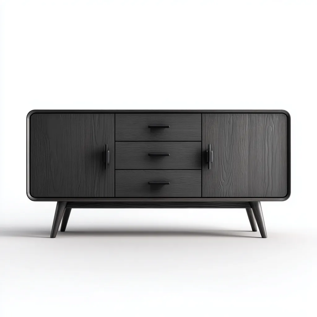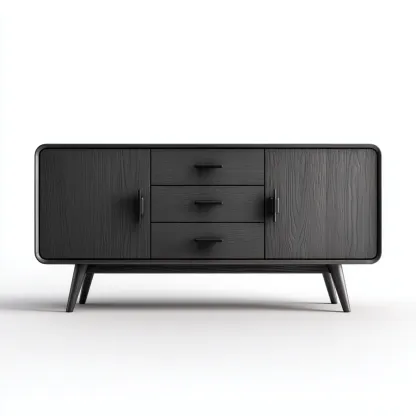 Nowoczesna szafka RTV w eleganckim czarnym wykończeniu to połączenie prostoty i funkcjonalności. Jej minimalistyczna forma oraz delikatnie zaokrąglone krawędzie tworzą harmonijny mebel, który idealnie wpasuje się w nowoczesne wnętrza salonu lub sypialni.