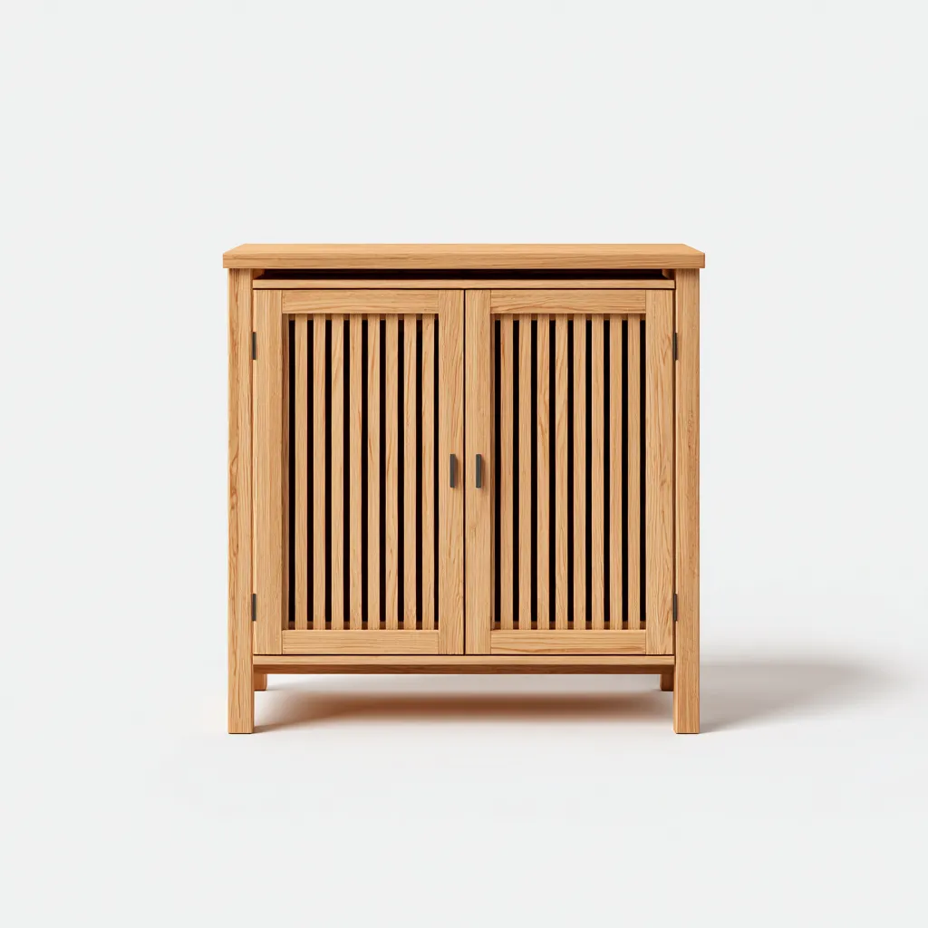 Wykonana z litego drewna dębowego, pokrytego ekologicznym lakierem chroniącym powierzchnię przed wilgocią i zabrudzeniami. Fronty z pionowymi listwami umożliwiają naturalną wentylację wnętrza szafki, co sprzyja utrzymaniu świeżości obuwia. Konstrukcja solidna i trwała, z precyzyjnie dopasowanymi elementami stolarskimi.