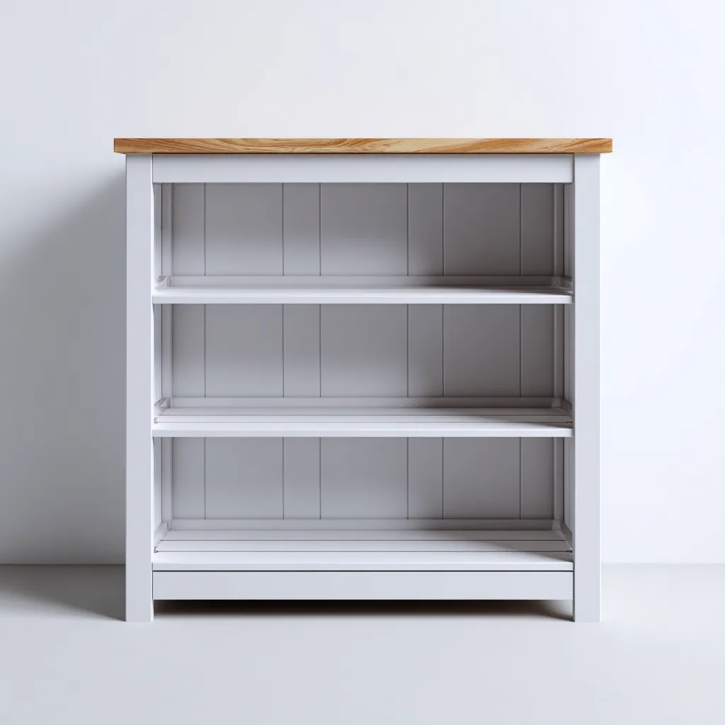 Korpus z płyty MDF lakierowanej na szaro, blat wykonany z litego drewna w naturalnym odcieniu, pokryty warstwą ochronnego lakieru. Półki stabilne i łatwe do czyszczenia, całość osadzona na solidnej konstrukcji zapewniającej trwałość i stabilność.