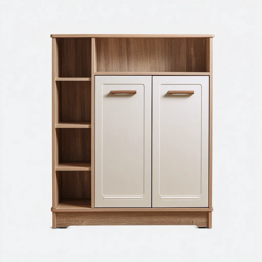 Nowoczesna szafka na buty łącząca elegancję jasnego drewna z kremowymi frontami. Praktyczny układ z otwartymi półkami i zamkniętym schowkiem ułatwia uporządkowane przechowywanie obuwia oraz drobnych akcesoriów. Idealna do przedpokoju w stylu nowoczesnym lub klasycznym.