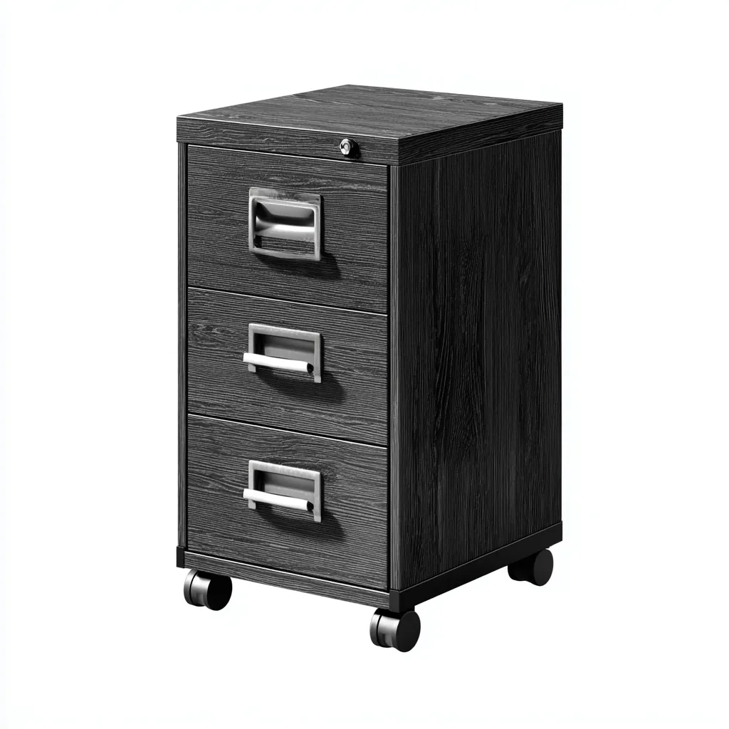 Szafa wykonana z wysokiej jakości drewna o strukturze czarnego dębu. Wyposażona w solidne metalowe uchwyty oraz zamek zabezpieczający górną szufladę. Stabilna podstawa z czterema kółkami umożliwia łatwe przemieszczanie, zapewniając mobilność i funkcjonalność.