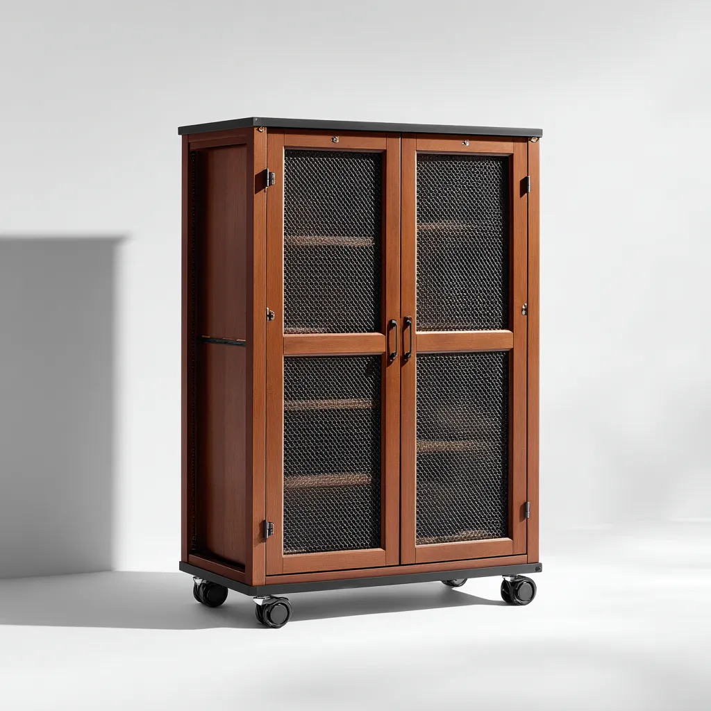 Wykonana z wysokiej jakości drewna w kolorze brązowym oraz stali malowanej proszkowo na czarno. Fronty z metalowej siatki zapewniają trwałość, a jednocześnie dodają meblowi charakteru. Konstrukcja osadzona na czterech solidnych kółkach umożliwia łatwe przemieszczanie.