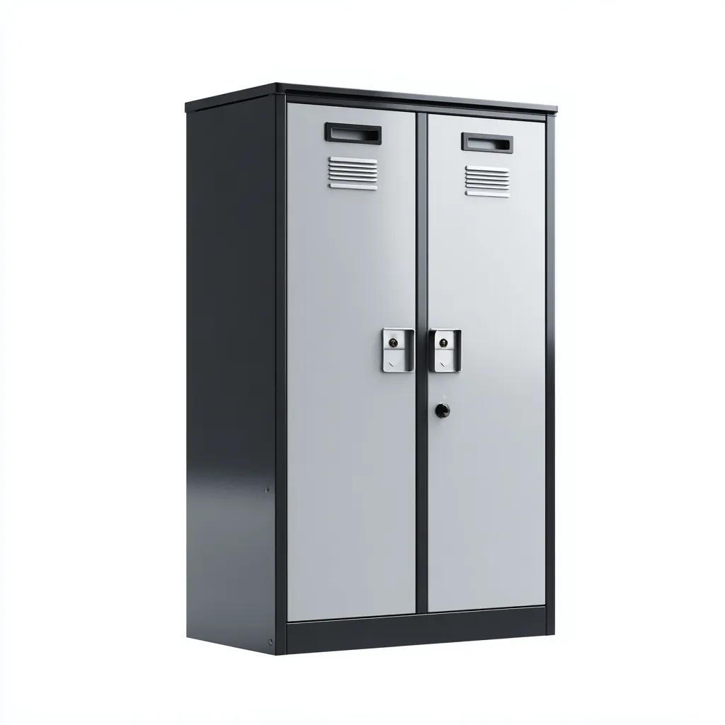 Korpus i drzwi wykonane ze stali malowanej proszkowo w kolorze szaro-czarnym. Drzwi wyposażone w otwory wentylacyjne oraz uchwyty z zamkiem, co zapewnia bezpieczne przechowywanie. Powierzchnia odporna na zarysowania, wilgoć i korozję, łatwa w czyszczeniu i konserwacji.