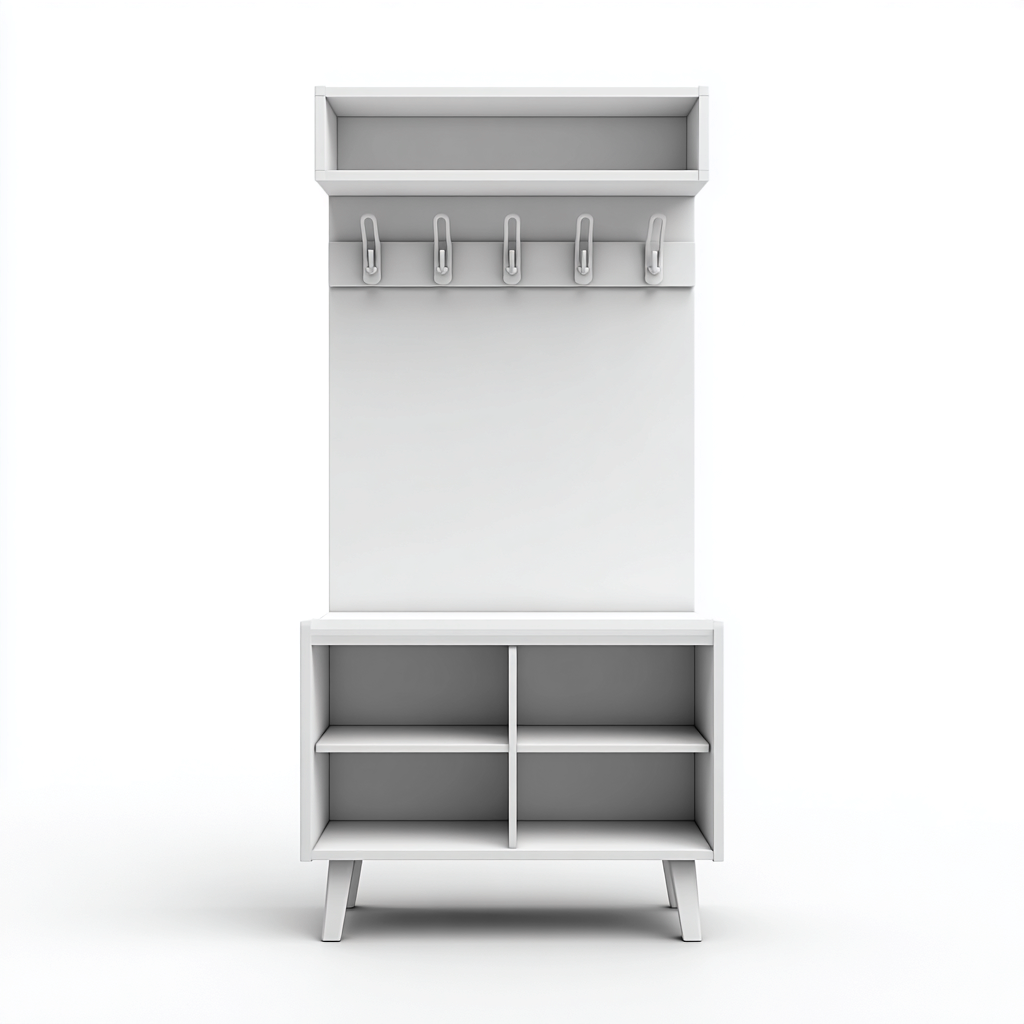 Nowoczesny biały wieszak na ubrania o minimalistycznym designie, łączący funkcjonalność i estetykę. Idealny do przedpokoju, garderoby lub biura. Posiada górną półkę na dodatki, pięć haczyków na odzież wierzchnią oraz cztery otwarte przegrody na obuwie lub kosze.