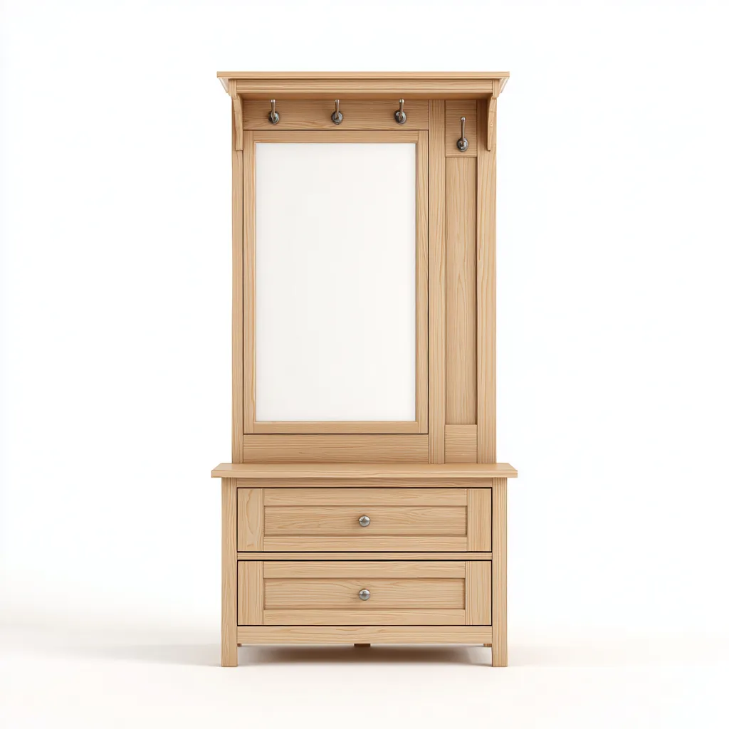 Klasyczny wieszak na ubrania z lustrem, wykonany z naturalnego drewna. Projekt łączy elegancję i praktyczność - idealny do przedpokoju, sypialni lub garderoby. Dzięki solidnej konstrukcji oraz przemyślanemu układowi haków i szuflad, mebel ten pomaga utrzymać porządek i dodaje wnętrzu przytulnego charakteru.