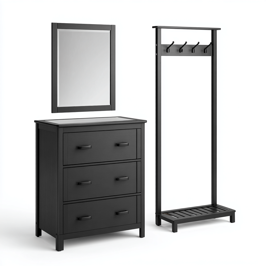 Nowoczesny zestaw mebli do przedpokoju składający się z wieszaka na ubrania, lustra i komody z trzema szufladami. Idealny do stylowych wnętrz, w których liczy się funkcjonalność i elegancki design. Czyste linie oraz jednolity czarny kolor tworzą harmonijną całość, nadając przestrzeni wyjątkowy charakter.